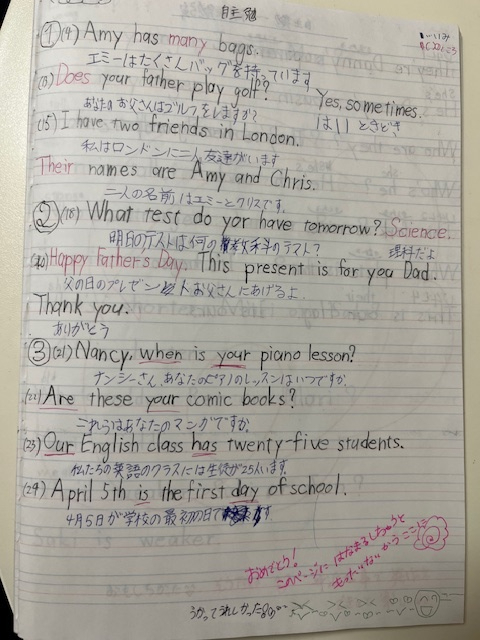 「交換ノート」は低学年と同じです。英検の受験を控えている場合にはそれに応じた宿題も出しております。